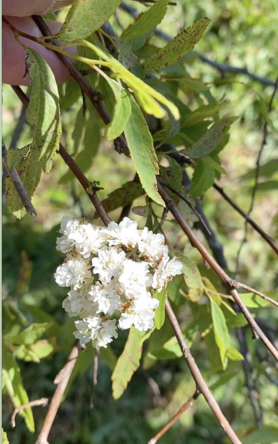 This rounded shrub is approximately 7’x7’x7′ was on the property when we moved here 25 years ago; clusters of small white blooms in spring (note the size of the clusters compared to the size of my fingers in photo); leaves alternating with slight serration. Last photo taken May 27, 2020.