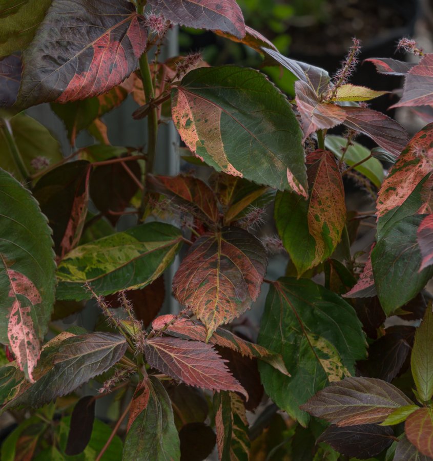 Grows in a pot, about 3 1/2 feet tall, unusual coloring, almot dappled or motled.