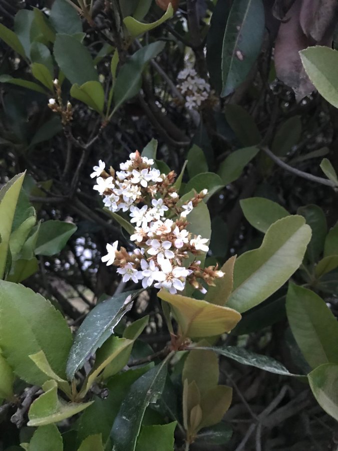 Large, dark green, flowering, evergreen shrub growing in Bluffton, SC.