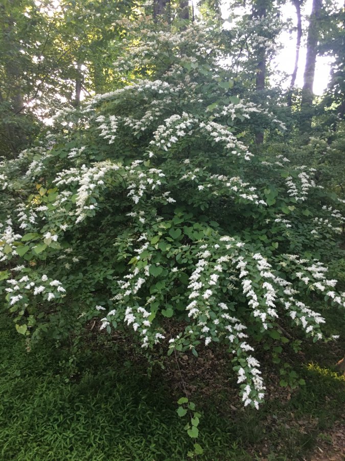 Fragrant and pretty flowers blooming late April early May. In partial shade under Oaks and Poplar; just appeared over the years. Currently about 8 feet in height and about 6 wide. Long trunk and long branches w/flowers cascading down.