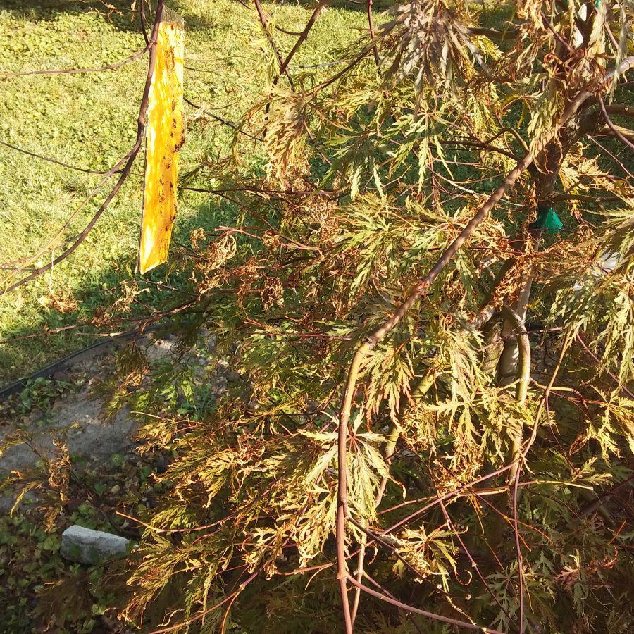 My new Tamukeyama Japanese maple is losing limbs of leaves that are dry, curled and dead. We had a wet spring here in St louis, Mo and I thought fungus when large fungus gnats appeared. I caught them w/ yellow fly paper and vinegar traps. Tree still dying in draught. I withheld watering. This spread to an established Japanese crimson maple and having same results. I have 4 more of these trees. I keep the area cleaned of leaves and debris. I used a Sulphur spray to no avail. What should I do?