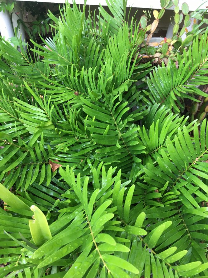 It is Zamia integrifolia, Florida Coontie. A Cycad. https://en.wikipedia.org/wiki/Zamia_integrifolia