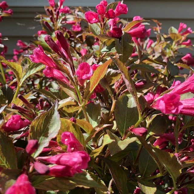 Maybe a cultivar of Weigela florida, possible ‘Alexandra’ aka Wine & Rose. Check it out and see if you have a match. Best wishes! http://www.missouribotanicalgarden.org/PlantFinder/PlantFinderDetails.aspx?taxonid=241521