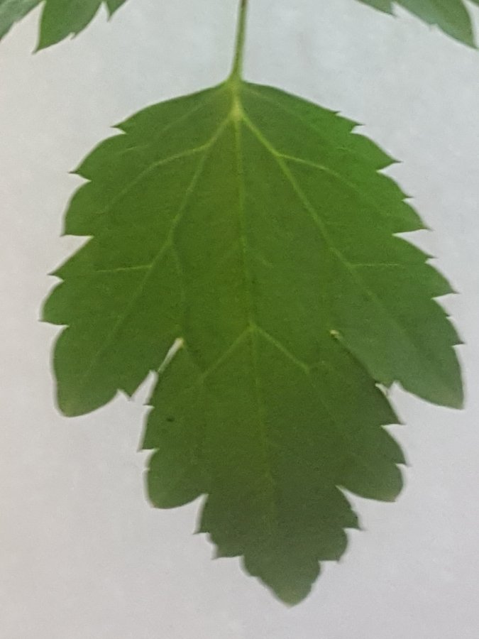 * T hree stems grow from the base (soil level) of the plant. I call them “main stems”. * The plant seems not to have any “trunk” like most woody plant have. * None of the main stems seems to be what I call a “leader”, a main shoot of or for vertical growth. * Each main stem divides at some point to 3 minor stems. * Each minor stem divides to 3 leaf clusters. * Each “leaf” is sharp-toothed. * Each “leaf” – 3 major lobes separated by 2 minor lobes. * Each “leaf” is dull, not shiny.