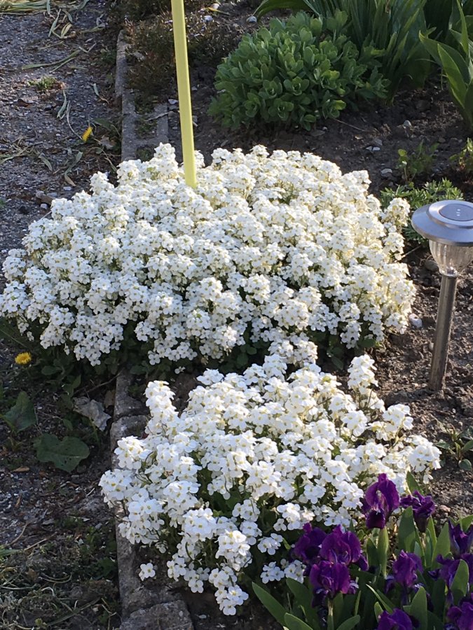 Maybe a cultivar in the moutain rock cress/Caucasian rockcress (Arabis caucasica). Best wishes! https://www.google.com/search?q=Arabis+caucasica&tbm=isch&tbo=u&source=univ&sa=X&ved=0ahUKEwiDoN7r2_DTAhWDbSYKHcVbAkoQiR4IhQE&biw=1879&bih=908#imgrc=Xo8WGTeYQaM_rM: