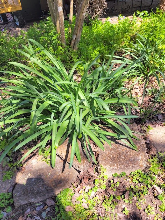 Bulb plant. Blades about an inch and a quarter wide and rounded on ends. No flower stem so far this Spring. Just bought the old house and have lots of surprises in the flower beds this Spring. Thanks in advance for the help.