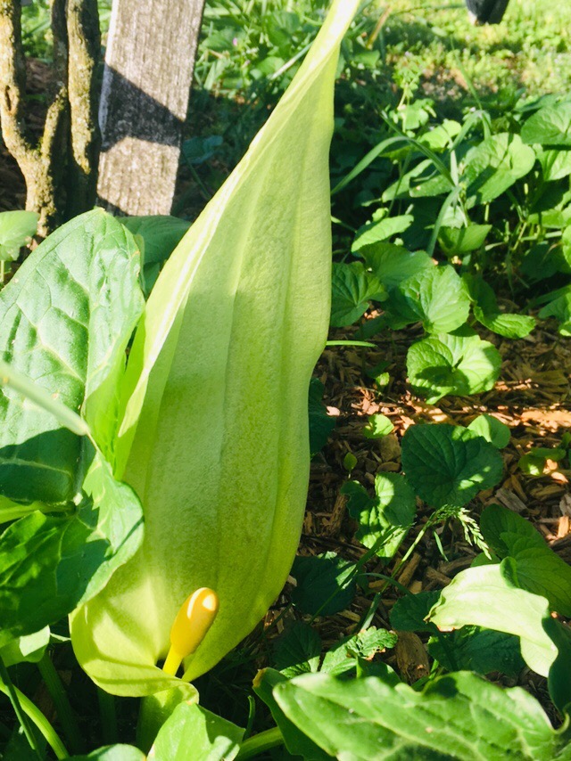 The leaf -which survived all winter outdoors-looks like a philodendron type or hosta. This amazing cone with a yellow ÔjackÕ in the center appeared this morning. IÕm unaware how it came to live in our yard, though we are in a rural setting in East Tennessee. Any ideas?