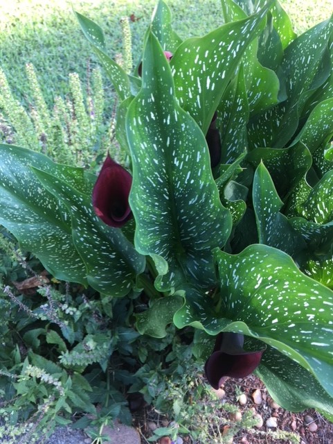 perennial flower ,comes every spring -Oct. large speckled leafs & waffle cone shape flower one color. grows the same every year apox. 16″ loves heat. Planted at mailbox 2 years ago come back the same strong & beautiful