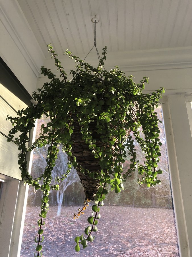 Top photo with hanging basket – Maybe a cultivar in the Elephant Food group (Potulacaria afrra), possible the dwarf Elephant Food (Portulacaria afra ‘Protrate Form’). Milddle photo – Maybe an Aloe? Its leaves would be gelatinous. If this is an aloe I can’t tell if which one this is for certain. I’m guessing perhaps Aloe vera syn. Aloe barbadensis). The other pot with two small plants are not close enough to tell. Bottom photo – The two pots in the front, maybe are in the Echeveria genus. I can’t tell if these are species or hybrids. Although the one with foreground with the leaves are rolled downwards maybe Echeveria runyonii ‘Topsy Turvy’? The pot in the back are too far to tell, possible also a type of Echevria? Need a closeup for clues. Best wishes?