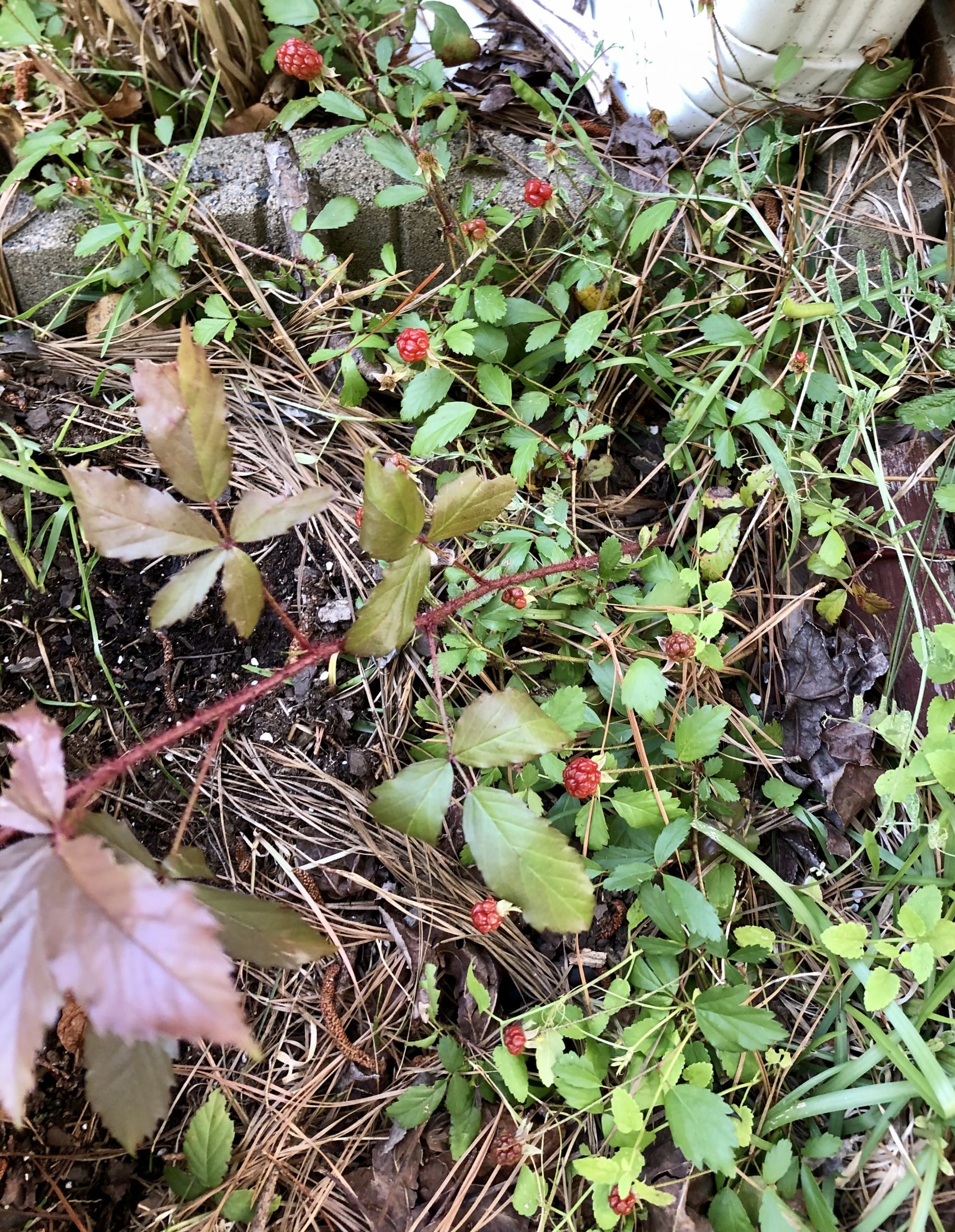 Last wk my son & I were treating the yard for red ants & ticks, when we found white blossoms in an old (NON-maintained) flowerbed along side of our house. We agreed that they’d become berries, but which type? The photo shows it’s new, fuzzy-red growth & berries, its low-lying.. we found more in the wooded area too! Dew, Logan or Black berries??