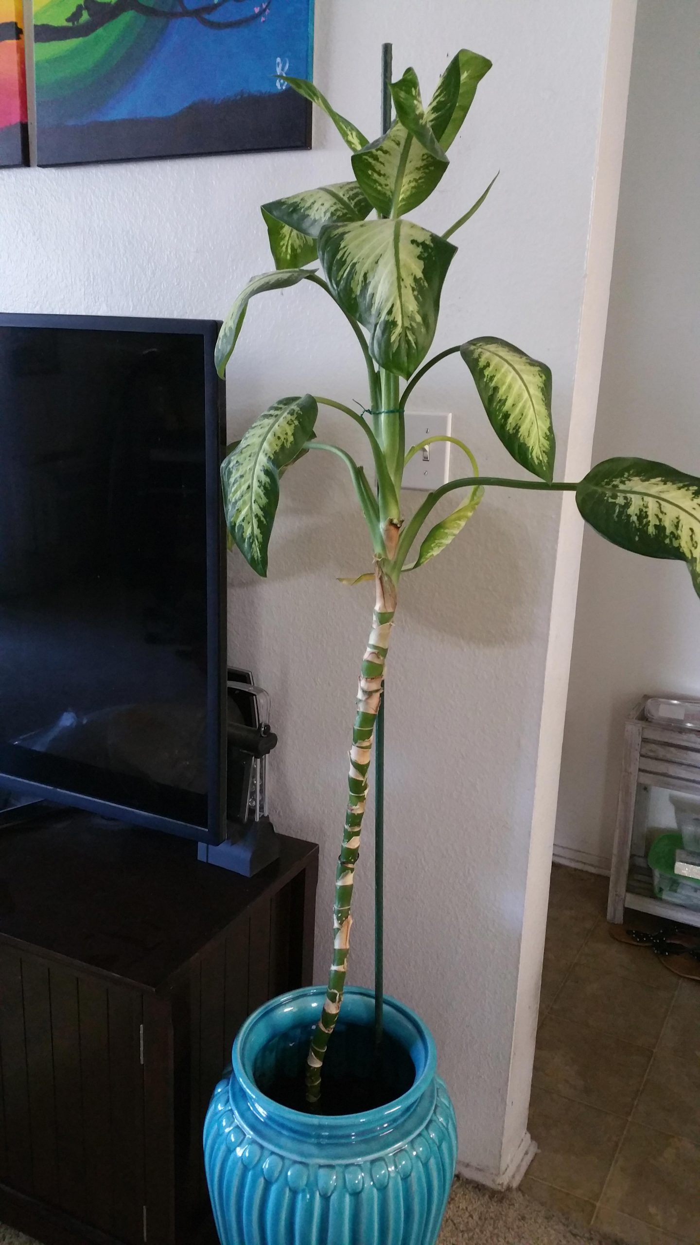 That looks like a dieffenbachia that has gotten way too leggy. This page suggests one possible solution: https://expert-hort.sws.iastate.edu/faq/view/id/533