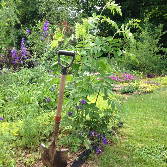 In one of the photos, I show the short-handled shovel to give clues of height – est. 5’10”. I know I should wait for flowers to bud, but so far – none! It does not appear to be woody. I was hoping for elderberry, being from MN and then thought “sumac” but I am still stumped. Simple pinnately compound leaf. I noticed the additional leaflets where the leaf joins. The blue flowers you see seem to be delphiniums but I had planted “dwarf” in the plot where I plant a packet of “wildflower mix”/yr