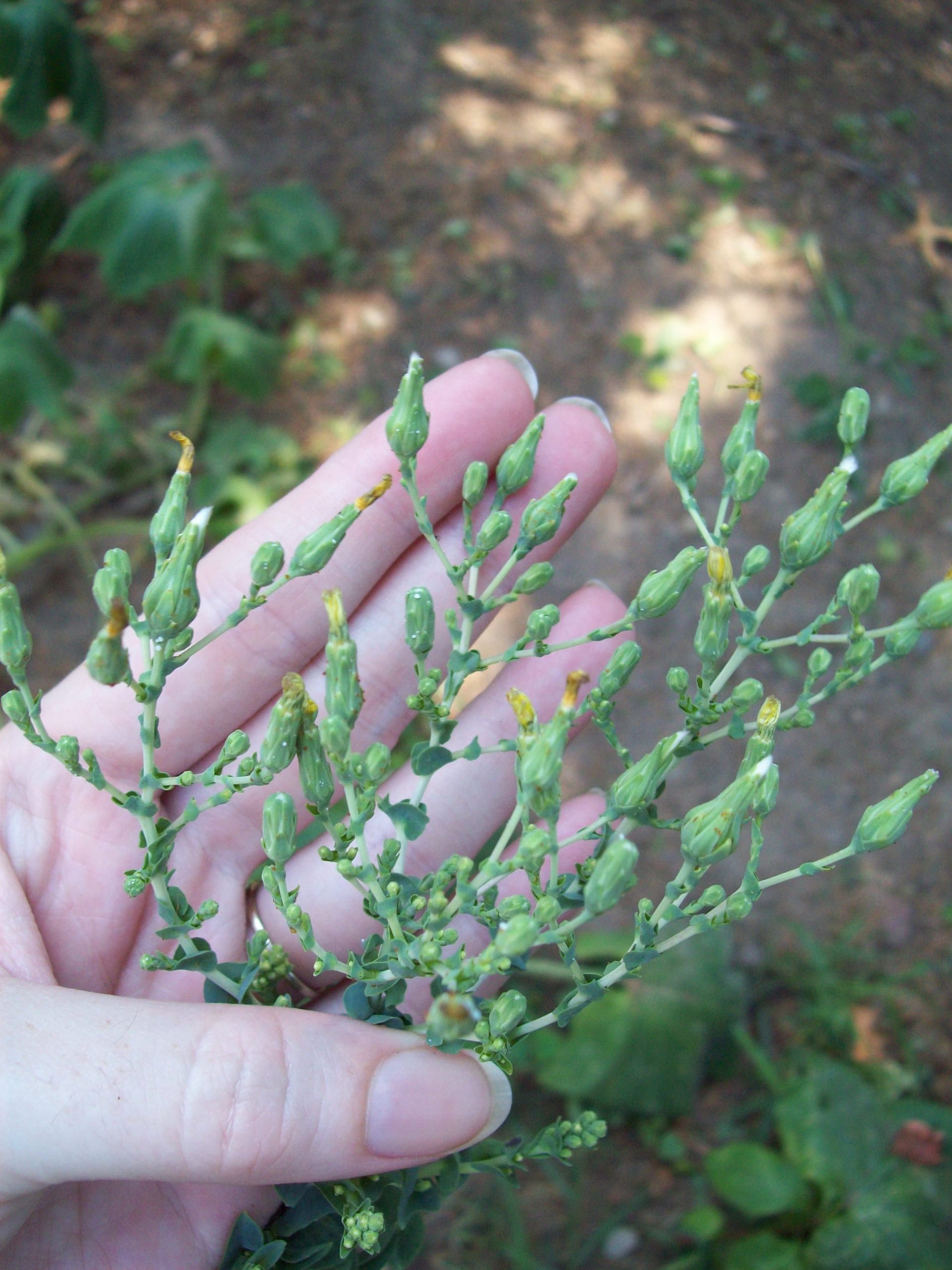 It sticks straight up and is about to reach the length of an adult’s legs. It has small buds only on top with hints of yellow petals. It has small leaves that are attached directly to the stalk, ie, leaves without stems). I think it is a fruit or vegetable.