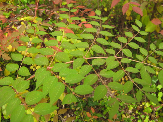 The leaf is a double compound with thorns on the underside. There are thorns all along the stem as well. They grow quite tall. Most shrub like with some over 5 feet. The pictures were taken while hiking in a hilly area that once was a town of wealthy residents. The town disappeared in the early sixties and is now part of a state park