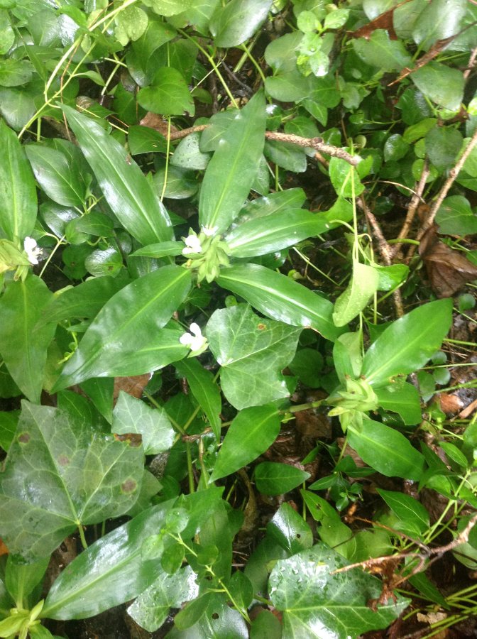 Plant in middle with elongated leaves and tiny flowers. Spreading in moist shady swale.