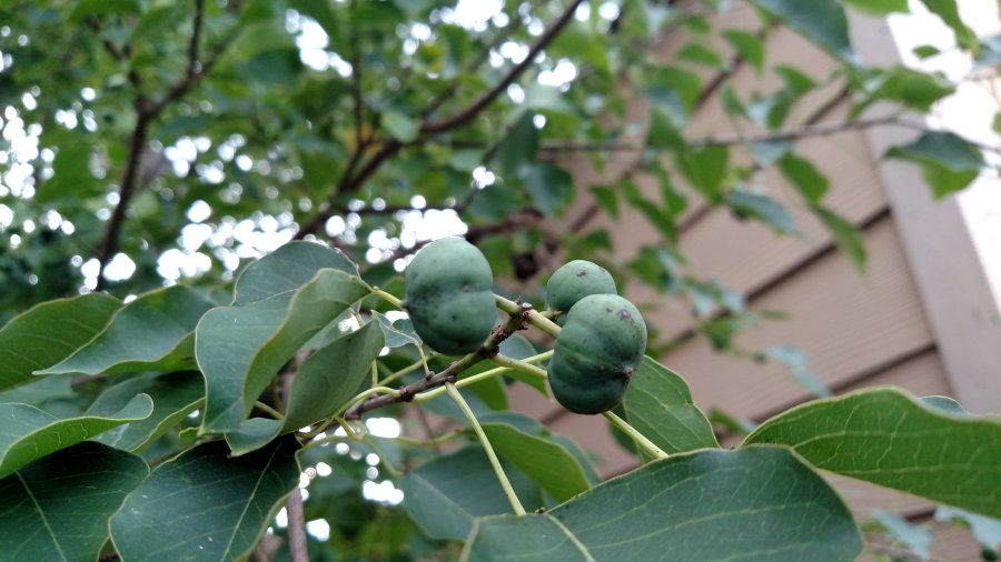 This is a small tree about the size a a wild cherry tree, but the fruit is about the size of a quarter. But, does not have any noticeable blooms. It drops all it’s leaves in the winter. It is a fast growing tree.