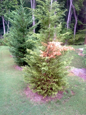 only this evergreen is affected and only this one full branch, should i cut it off or just leave it. the affected one is also lighter green than the others. started slow and this is what it looks like over about a month