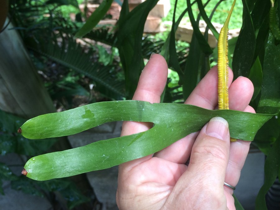 this clump of flat leaves appeared in a hanging basket; it seems to have yellow spores on a supporting stem hanging from the mid vein underside
