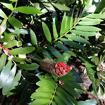 Low growing tropical with alternate leaves and flower/seed stalk with circular groupings and layers of seeds encased in a bright red pulpy berry.