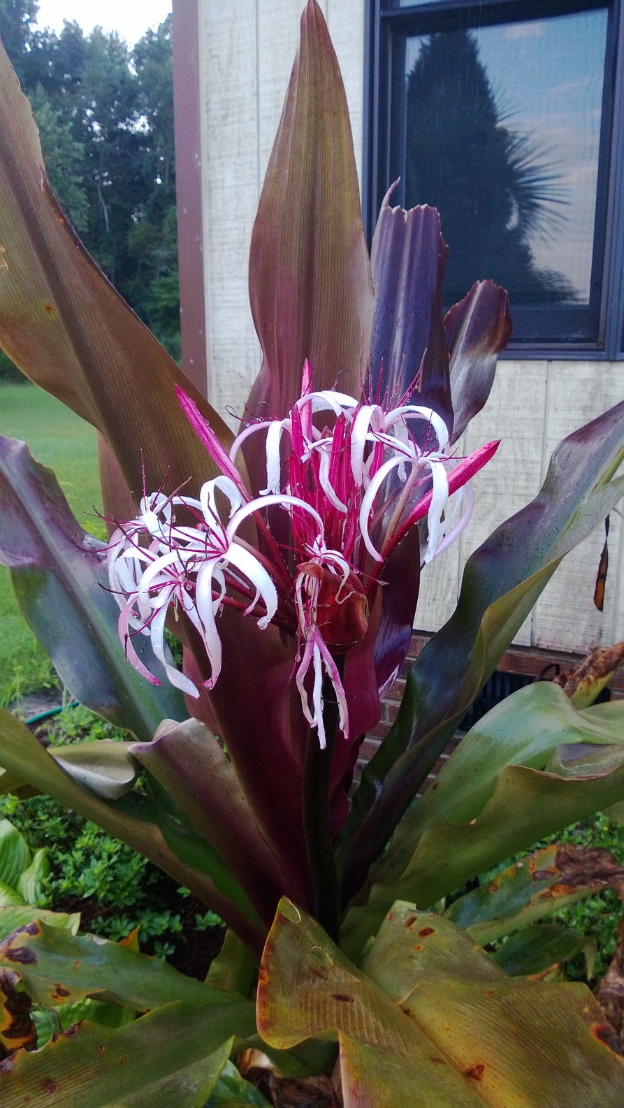 Purple and Green long leaf plant, approximately 7 feet tall. Spider shaped White and fuchsia flowers on stalks. Produces offshoots at the base.