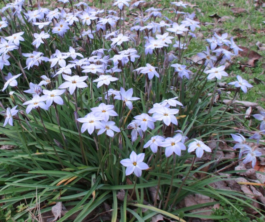 The six petaled flower comes up in a clump as if from a bulb or something, but I didi not plant it. Flowers 2 – 3 inches tall. The tiny four petaled flowers are 1 to 2 inches, mostly below 2 inches, some are blue/purple, a few white. Tiny oval leaves with pointed tip which appear to be opposite. These both bloom in March and/or April