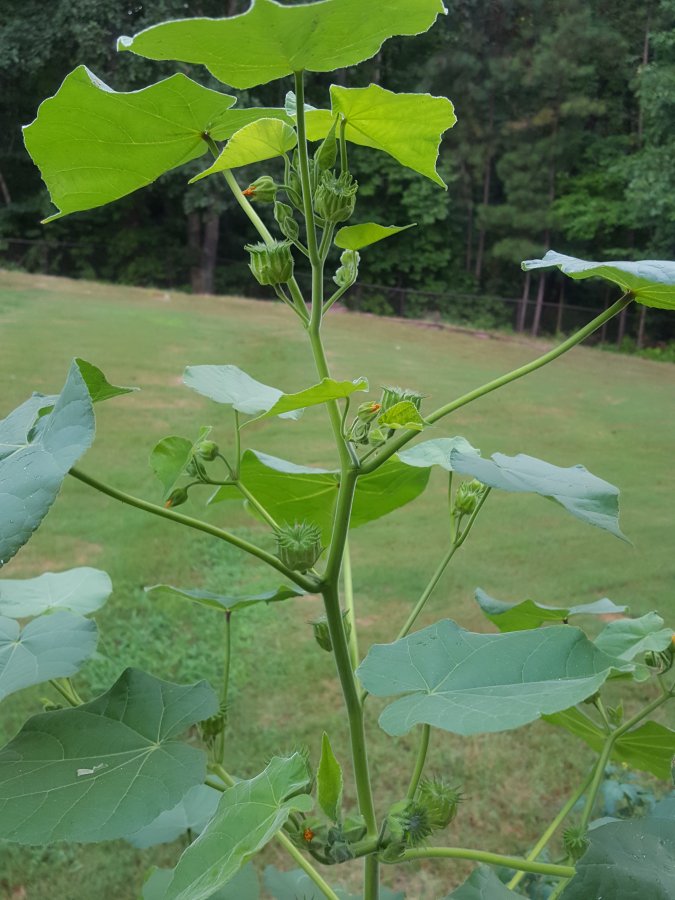 This plant is located in a bed under a bird feeder. Not sure if it is a volunteer from a bird seed or from “direct deposit” from a bird. The plant is about 5 1/2′ tall with leaves as big as 7″ across.
