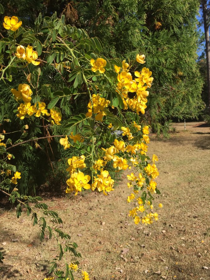 This plant has a beautiful yellow flower. The plant has long stalks that drape over when heavy. The green leaves are dainty and cluster like.
