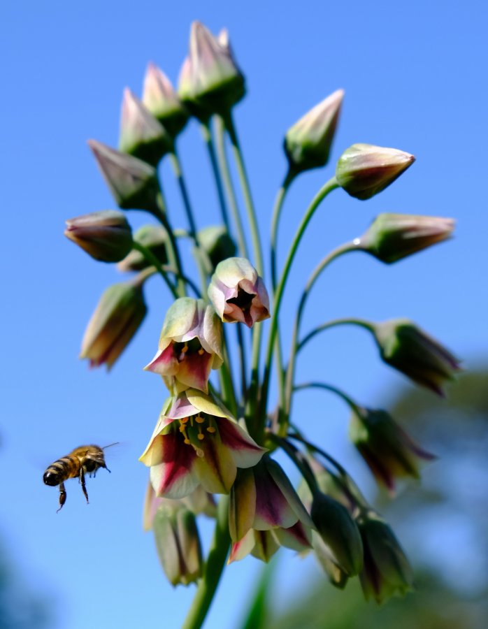 Maybe Mediterranean bells/honey garlic (Allium siculum). Check it out and see if you have a match. Click on images from the included link to enlarge. On the side note, the hovering bee makes this a very nice touch to the flowers. Best wishes! https://en.wikipedia.org/wiki/Allium_siculum