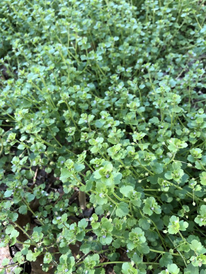Maybe ivyleaf speedwell (Veronica hederifolia)? Too bad its flowers details are not too clear. Check out the included link below for ivyleaf speedwell’s images. Best wishes! https://courses.missouristate.edu/pbtrewatha/ivyleaf_speedwell.htm