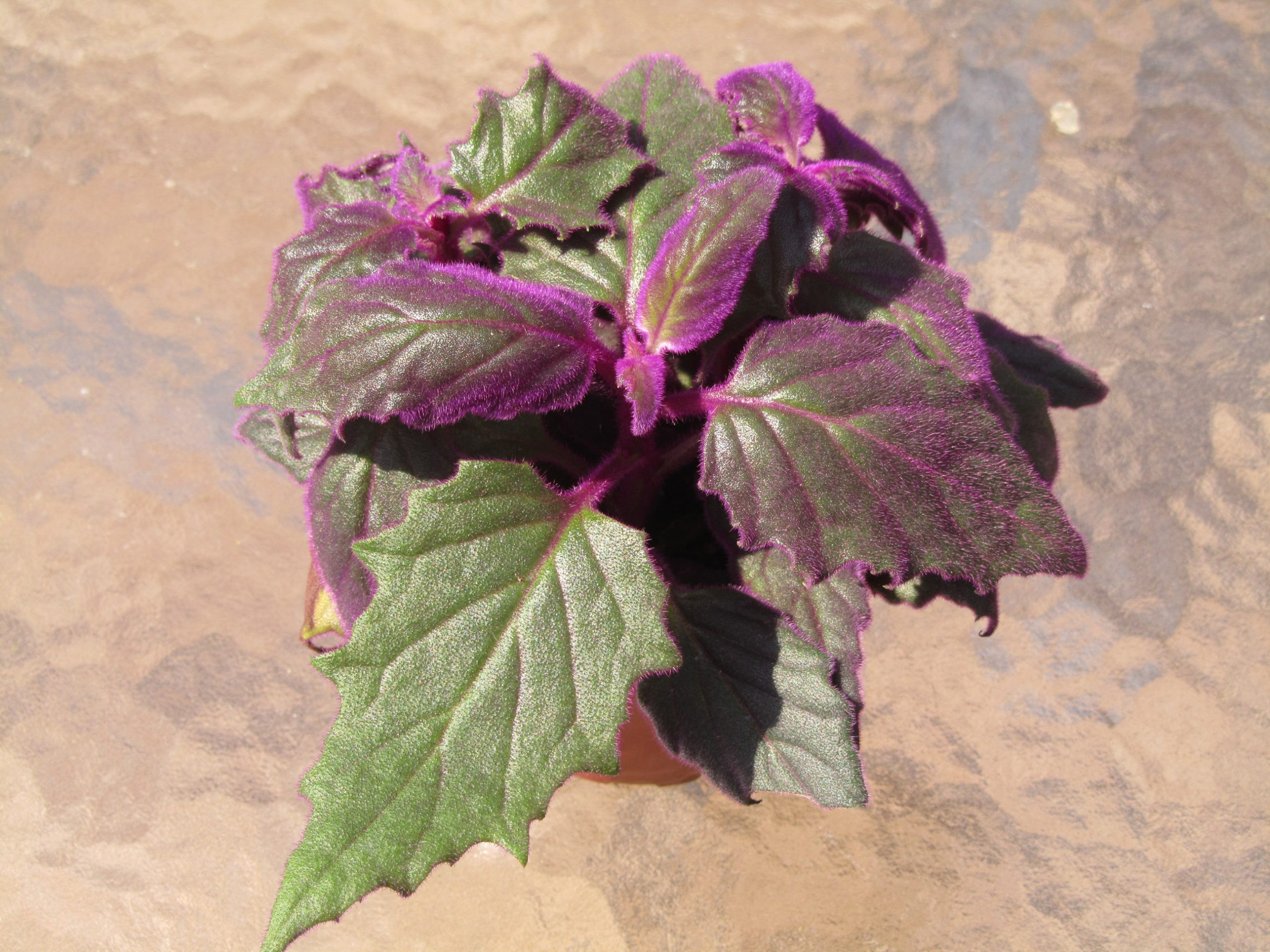 Small potted plant with spiked, fuzzy, green leaves with an irredescent purplish color fringes