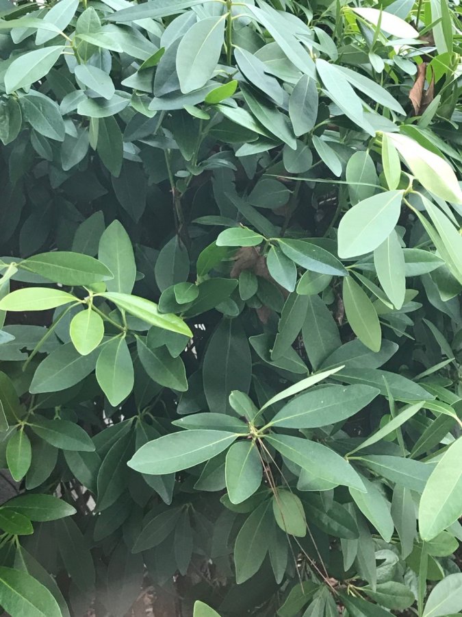 This shrub is directly in front of my house in Northern Georgia. I would like to reduce its height in half. It grows rapidly to about 8 feet before I trim it down to 6 feet. I want to cut it back to 4 feet high but I’m worried it will die. I don’t know what this shrub is. It has smooth woody trunks. Leaves are glossy and it smells like basil when trimmed. I haven’t seen any flowers but that might be because of the way I prune it. Any idea what this is?