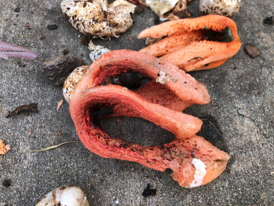 Today I noticed this orange/red mushroom-like thing growing in my garden. I’ve never noticed it before. The orange/red portion is above the ground while the egg-like soft portion is below the soil. It smells and looks like it is regenerating. Can you identify it and tell me how I can kill it and stop it from spreading?