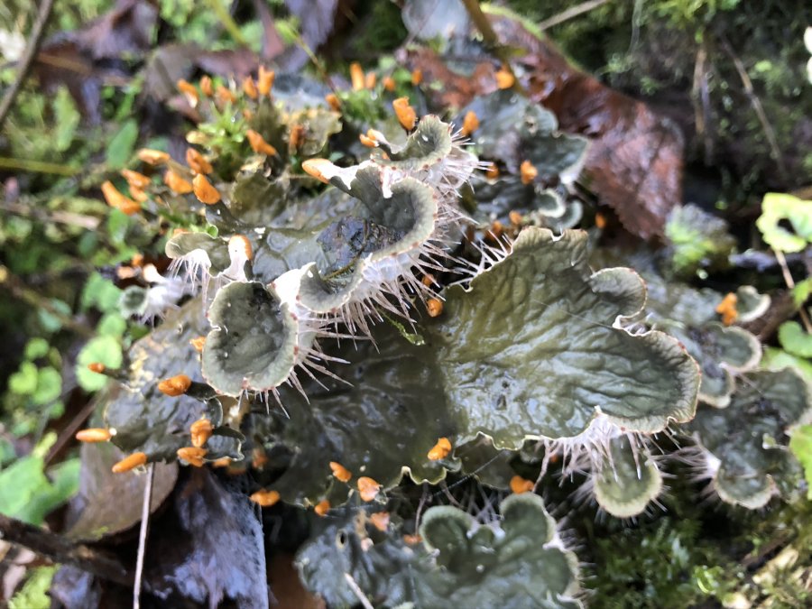 Maybe a pelt lichen species in the Peltigera genus? According to sources the orange parts are ‘apothecia'(spore bearing structure). Sorry, I can’t tell which species this is. Check out some of the species from these included links. Best wishes! Link for fog pelt lichen (Petigera neopolydactyla). Click on images to enlarge. https://www.projectnoah.org/spottings/81494625