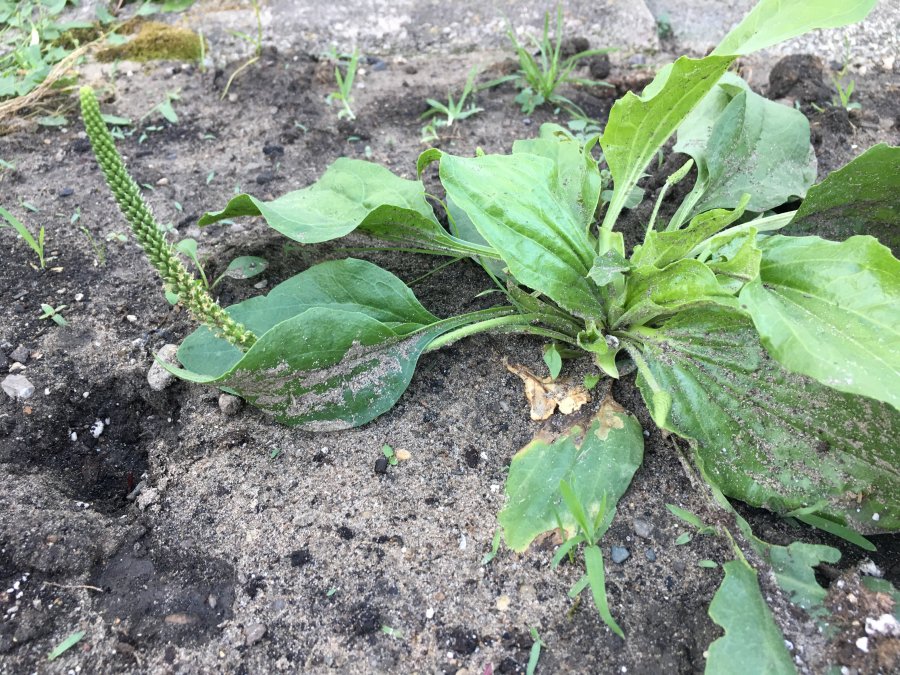 Broadleaf plantain. http://www.msuturfweeds.net/details/_/broadleaf_plantain_7/#weeddetail