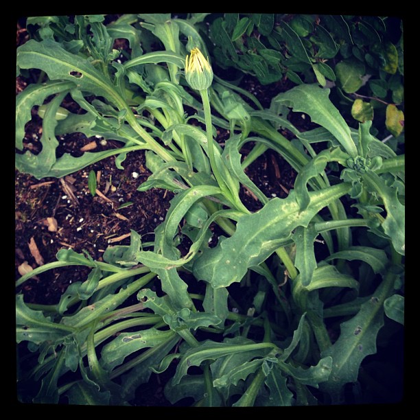dandelion like leaves. flower appears to be yellow and daisy like