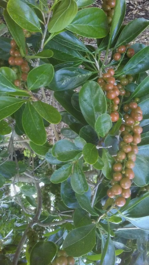 This shrub is about 9 feet in height, multiple limbs, it had tiny white teardrop clusters of scented white flowers in the spring and now has been forming these berries that are changing color. I do not know the final color of the berries. this tree grows and kinda looks like a ficus. they are planted in groups of three and have been shaped into umbrella tops and are quite pleasing to look at. One grouping is in full sun, the other in partial shade. The full sun seems to be a better fit.