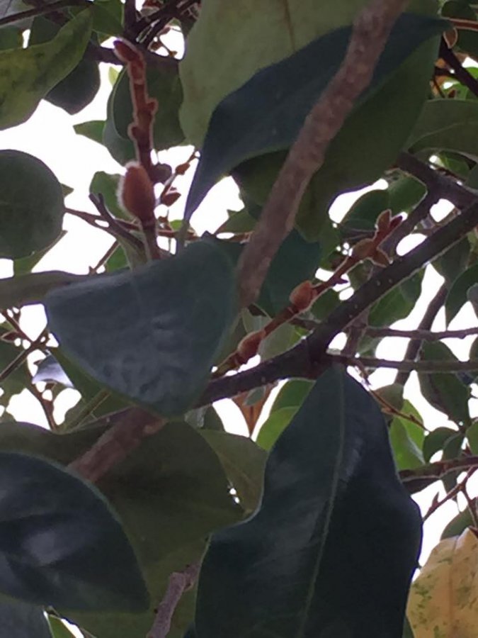 I wish I could see more of the shrub to be certain. I could only speculate that with those fuzzy buds, this could be type of Magnolia figo formely Michella figo or one of its relatives (M. figo var. skinneriana & M. figo var. crassipes. The common name is ‘banana shrub’ dues to flowers have a sweet banana like fragrant. Check it out and see if you have a match. When it blooms and you still don’t know, make new post with photos of flowers & the whole plant. Check out the included link, scrolling down toward the end of the page for a description and the differences of these banana shrub varieties Best wishes! https://www.clemson.edu/extension/hgic/plants/landscape/trees/hgic1015.html