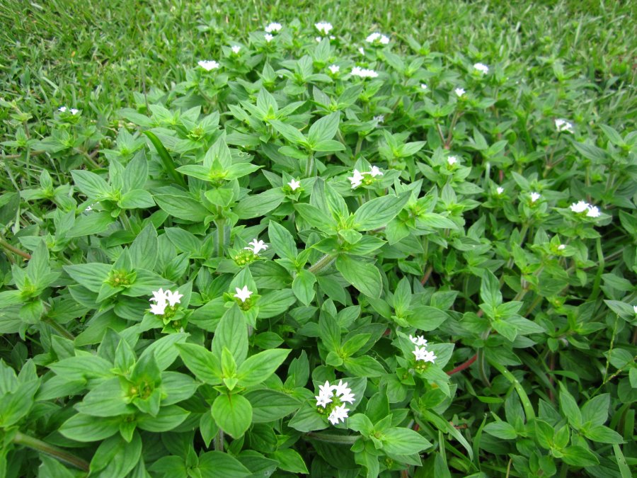 Full sun flat grassy location in the midlands of SC. Low to the ground and growing in substantial bushy patches/bundles. Two layers of leaves that look similar to mint plants. Tiny white flowers.