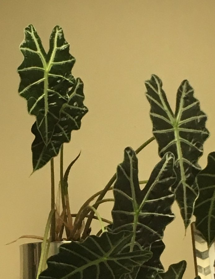 Maybe African Mask/ Alocasia Poly(?). According to sources, African Mask is a hybrid (not a species) of “Alocasia longiloba Miq. (formerly known as the synonym A. watsoniana Hort.) x Alocasia sanderiana Hort”. It’s commercial name “Alocasia Amazonia”is not a scientific name. I’m not an expert of this Alocasia genus, however due to miss identification, Africa Mask is also listed with an incorrect name “as Alocasia x amazonica”. The name common “Elephant Ear” is also shared by several species in the Aclocasia genus. Best wishes!