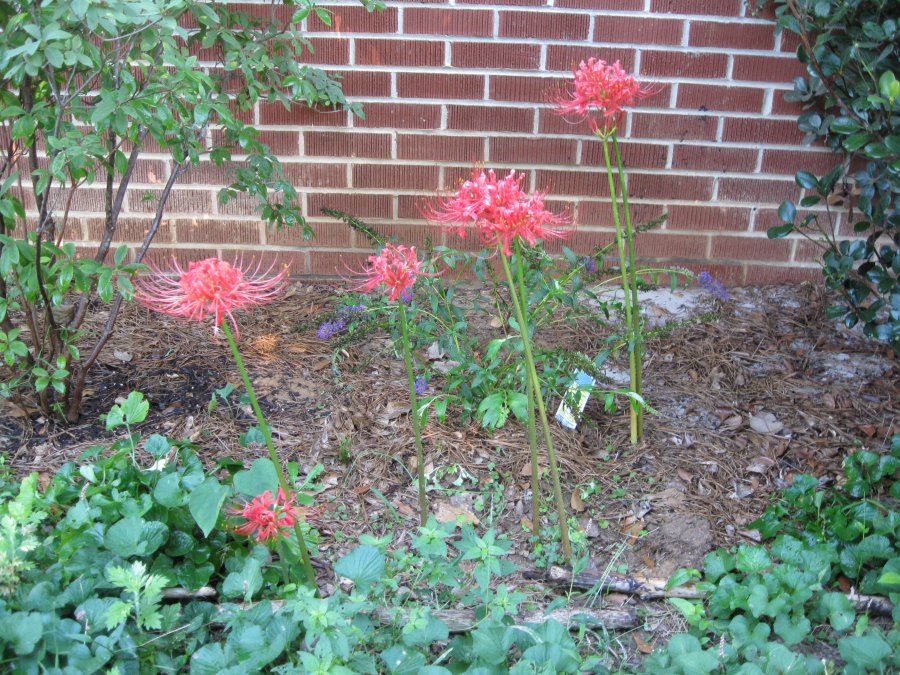 I found these growing wild & blooming — in SEPTEMBER–!– of a house about to be torn down in Suwanee. I dug up several (they grew from small bulbs or tubers) and planted them in my yard. They don’t come up until Fall, at which time they start like an Amaryllis, with the flower-stem and bud only, no leaves. The stem grows to a height of about 1-2 feet, then opens in these beautiful blooms that remind me of honeysuckle or wild azalea. What ARE they?