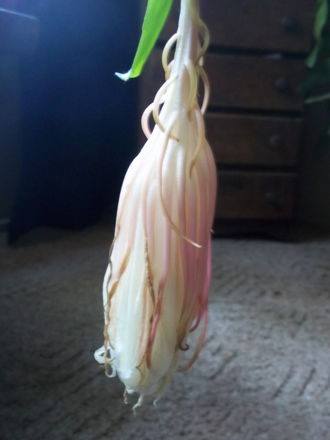 The pictured bloom was taken after the bloom began to fade. Didn’t find it till now. The actual boom is 5 inches long. The plant has Cristmas cactus type leaves and gives off long shoots (some 6 ft. long) that have tiny bristle like spikes comes out. Was told this blooms every 10 years. It has bloomed twice since I’ve had it, 5 years. Sure would love to know what it is. Thanks so much in advance.