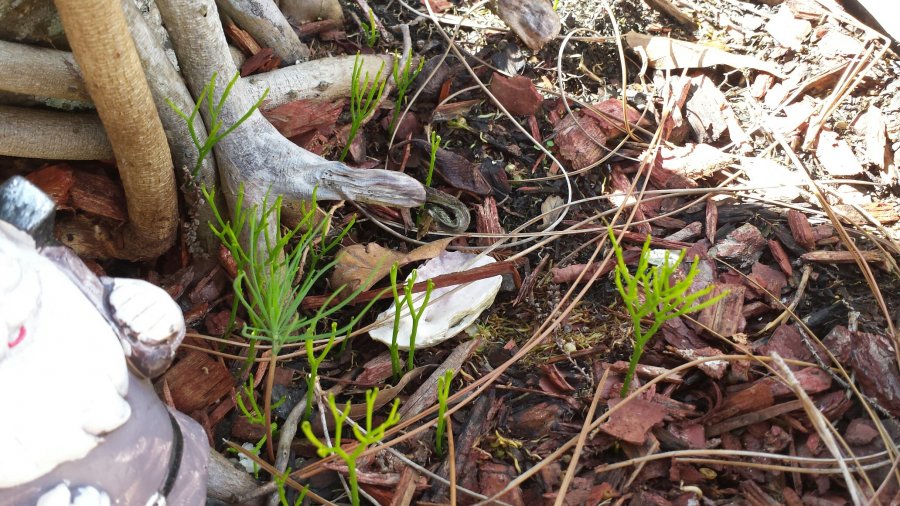 Botanical details are not to clear to call. Also these are too young to tell more. I could only speculate for you at this stage. These might be a type of whisk fern (Psilotum) (?). Perhaps you could give us an update as these grow more mature. Check out P. nudum, one of the whisk fern species from the included link below, click on the arrows tab to enlarge. Again I’m only guessing. Best wishes! On a side note, it appears there is also a pine seedling near Santa’s left foot (?). https://www.ipmimages.org/browse/detail.cfm?imgnum=5419542