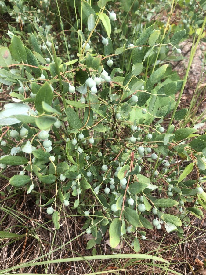 We’ve started clearing areas around our property for building, gardens, etc.. and I have noticed that we have a lot of these bushes all around. They sort of look like wild blueberries to me, but I’d be afraid to eat them unless I knew for sure. 🙂 The bushes vary in size, from 6 inches to 2 feet tall. The berries are light gray-blue with a small crown on the bottom. The leaves are lighter green on the underside than they are on top. I cant say if they flower b/c I’ve just noticed them in the past 2 weeks.