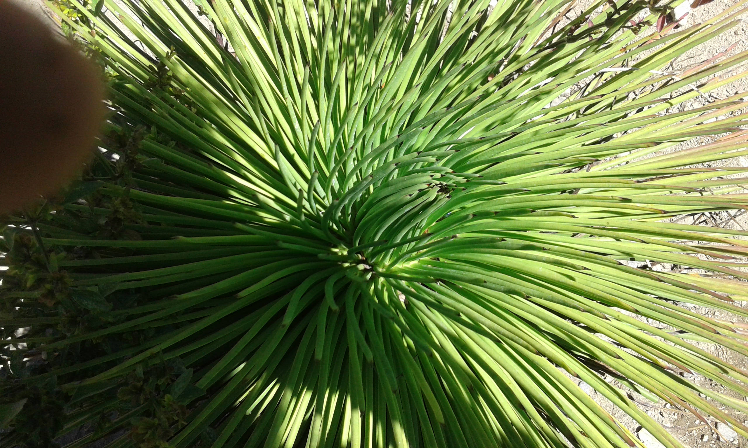 Agave geminiflora can have 100-200 leaves which are linear, stiff, dark green, and have convex edges with white horny lines and curled threads while my plant has perfectly cylindrical, smooth fleshy leaves. Richard