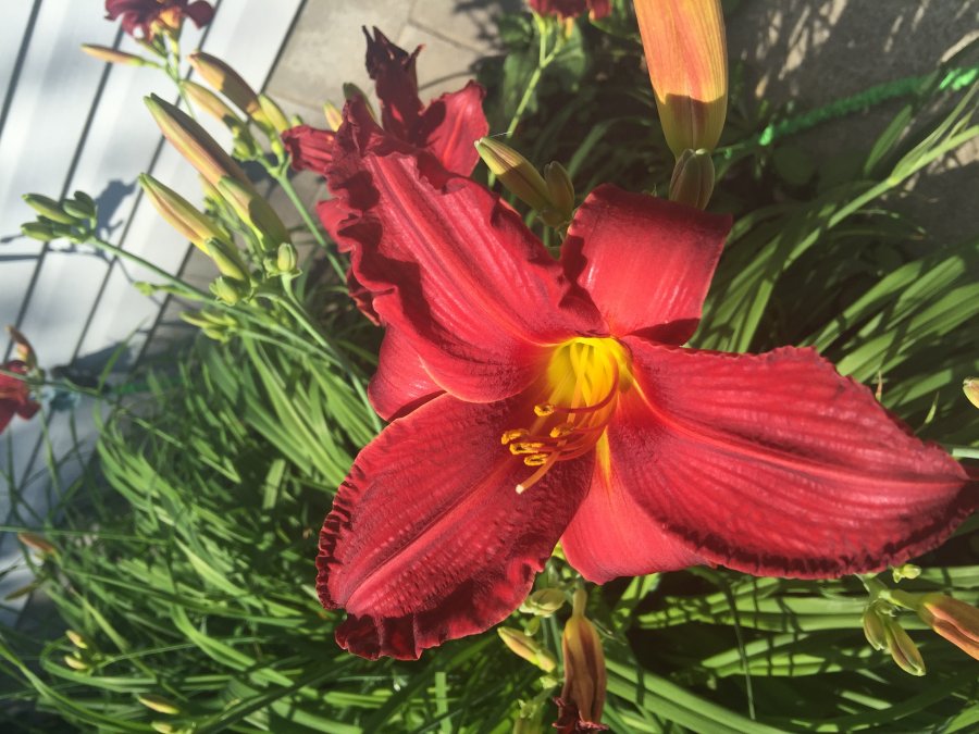 Agree with the daylily. Not able to see the rest of the second plant. I’m guessing, maybe a type loosestrife (Lythrum). this might a purple loosetrife (Lythrum salicaria) or one of its cultivars. Check it out and see if you have a match. Best wishes! https://www.google.com/search?q=Lythrum&tbm=isch&tbo=u&source=univ&sa=X&ved=0ahUKEwiEs96as8nNAhXk54MKHSUSCDwQiR4IgwE&biw=1711&bih=833