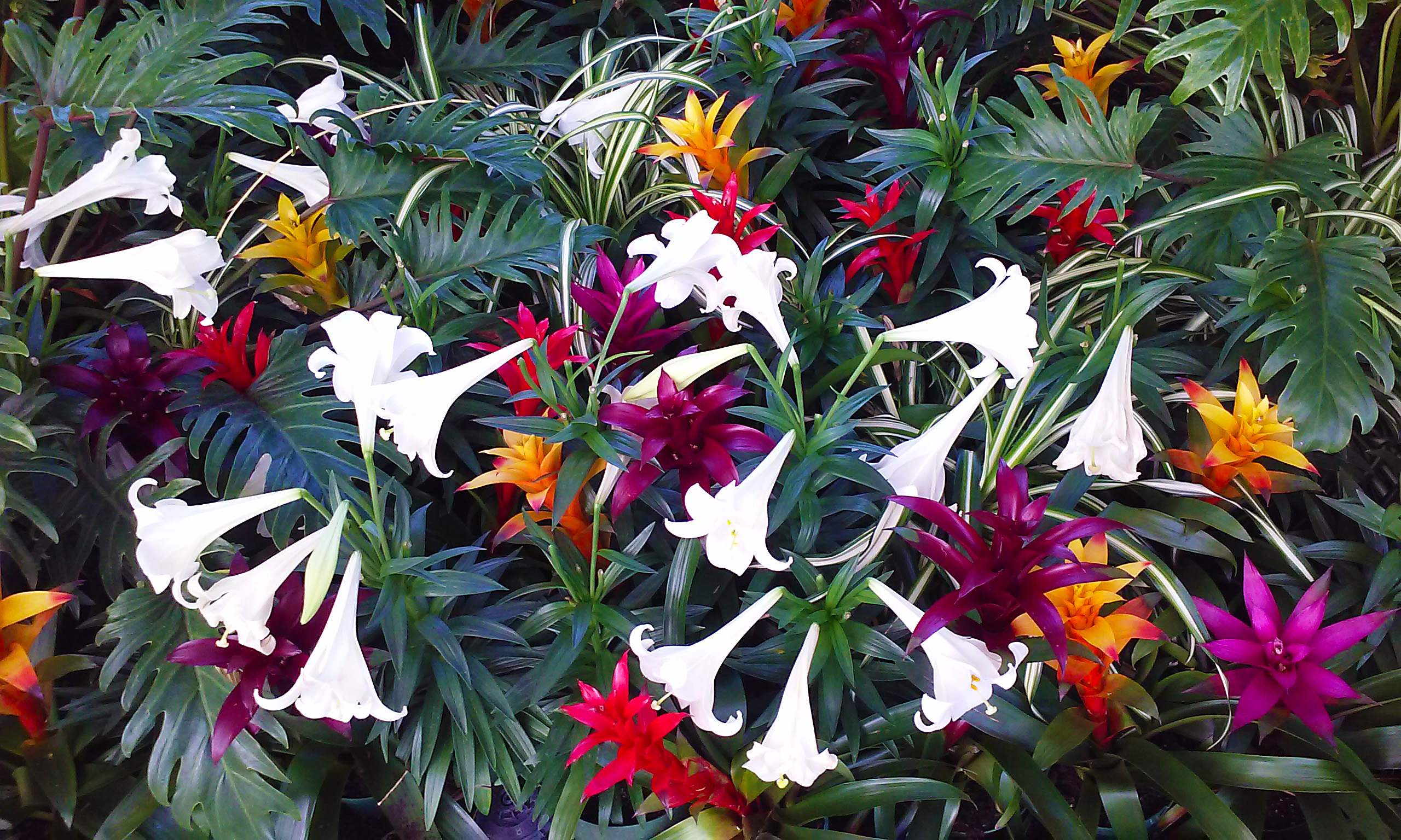Looks like Easter Lilies, Guzmania Bromeliads and Philodendron xanadu (leaves).