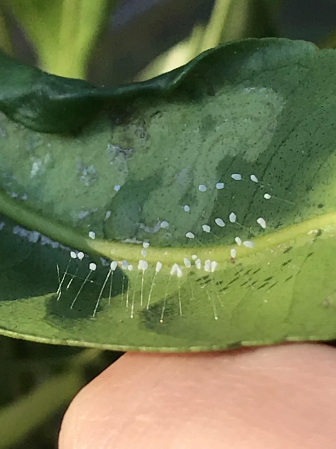 I found these white things on a satsuma leaf. Last year by this time (October 26th), I found the same thing but appeared on a stick of wood.