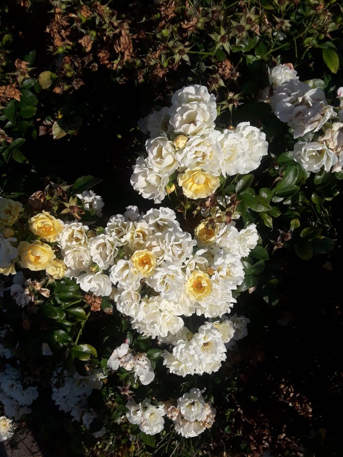 Rosa genus has numerous classification & hundreds of cultivars, it’s difficult to tell the exact ID with out details i.e. petal counts, once blooming or rebloom type, leaves, hips, etc…. you should try the experts on the included link below. I don’t know which type of rose this is, but you should check out cultivars in the Drift Rose group. Some of these include White Drift, Popcorn Drift, Ivory Drift, etc…Best wishes! http://www.atlantarose.org/