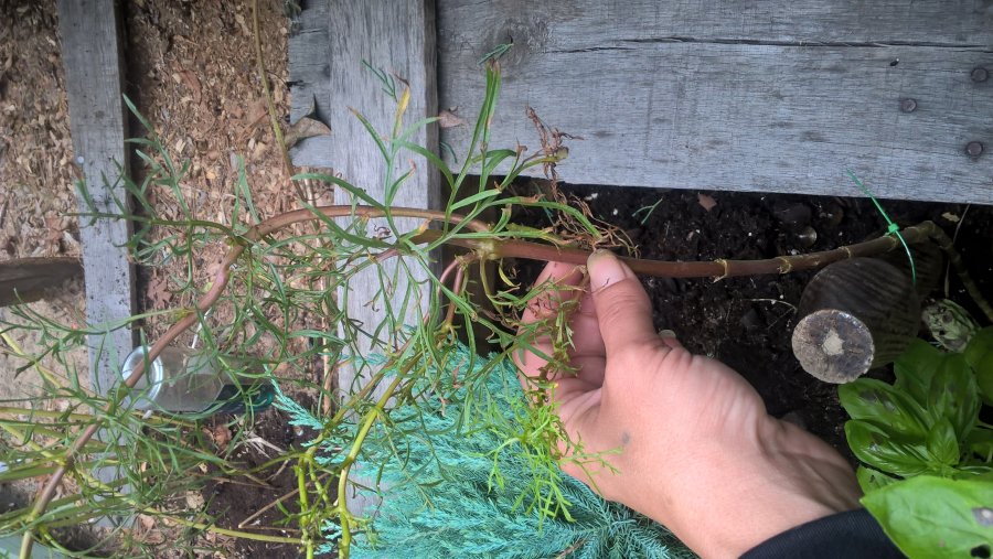 With out flowers to narrow down, I’m taking guess here. It could be common Cosmos (Cosmos bipinnatus)? If this isn’t that, when it blooms and still don’t know, make new post with picutre of flowers. Best wishes! https://www.google.com/search?q=cosmo+bipinnatus+stems&sa=X&biw=2144&bih=978&tbm=isch&tbo=u&source=univ&ved=0ahUKEwiVyoebkKnPAhUJMyYKHXLJDtgQ7AkIOg&dpr=0.9#imgrc=0vOXlpQQS9mbrM%3A