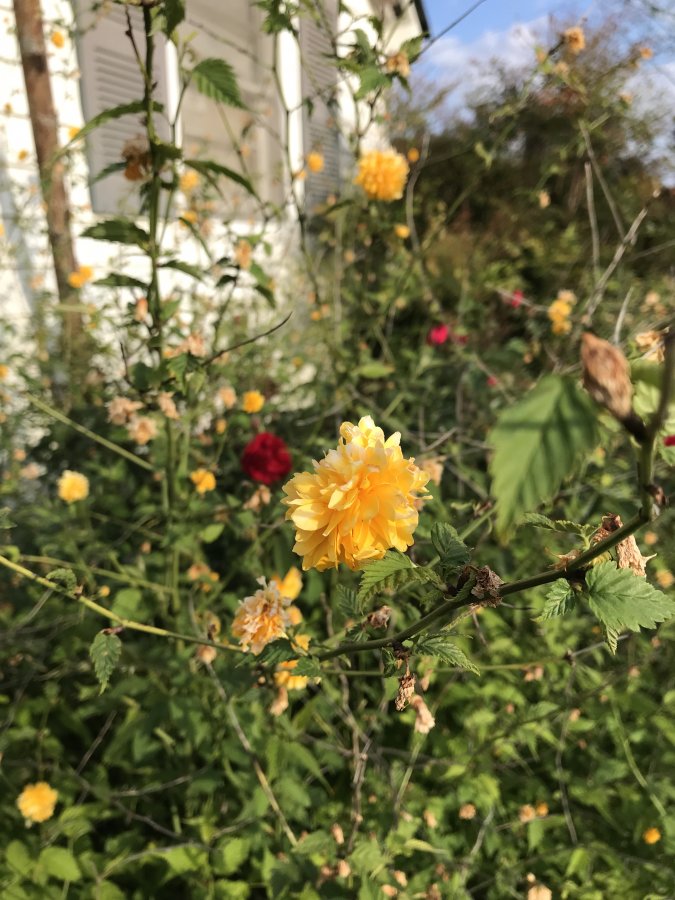 Maybe Kerria japonica ‘Pleniflora’ (?). Best wishes! https://en.wikipedia.org/wiki/Kerria_japonica